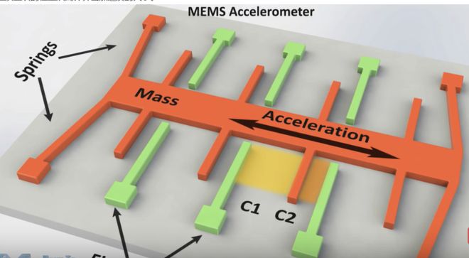 加速度计的原理较为简单,就是通过牛顿第二定律来测量三轴的加速度,图中的质量块受到加速度的作用会左右运动,而两侧的电容能测量质量块的位置从而计算出加速度的大小。