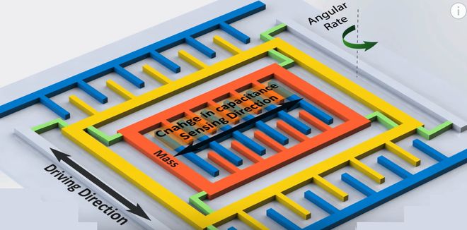 在实际的MEME传感器中,大致结构如图,在一个方向保持左右运动,若有旋转的角速度则会在垂直的方向产生科氏力,通过电容的变化来反映这个力的大小便能得到旋转速度的大小。