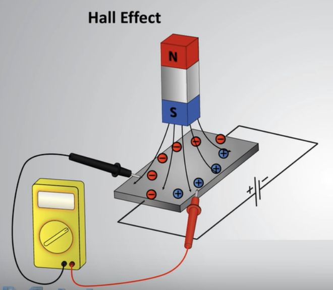 磁力计则是通过霍尔效应来测量磁场的强度,高中物理中学过霍尔效应也很简单,如图。一端通电,在磁场的作用下电子会往垂直的方向上跑从而在侧面产生电场,通过测量这个电场的强度及正负则能间接测量出场强的大小。